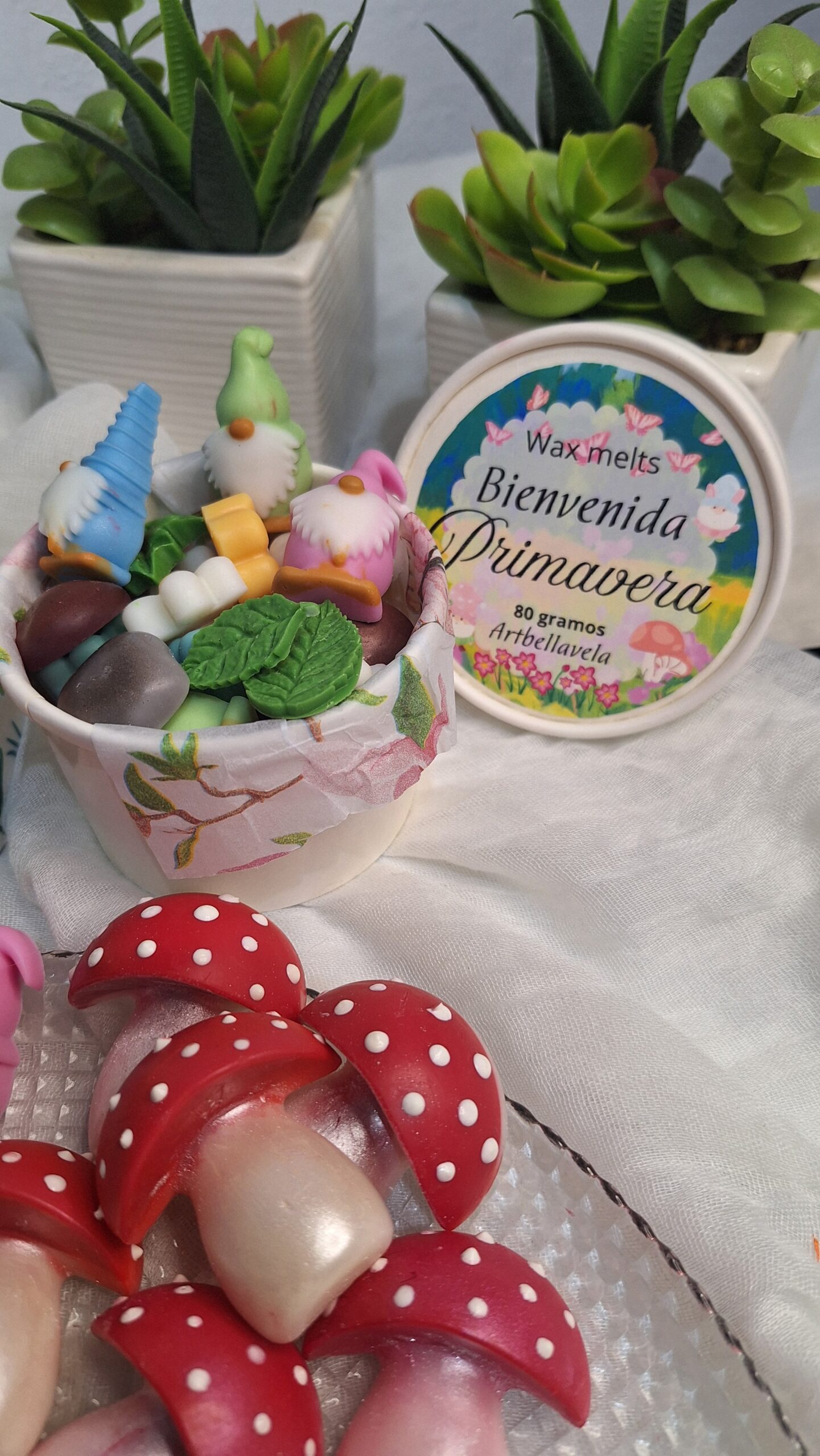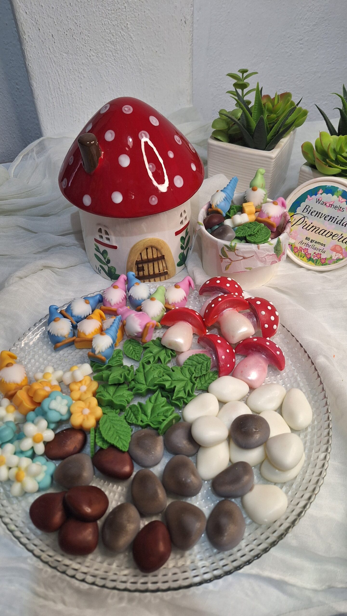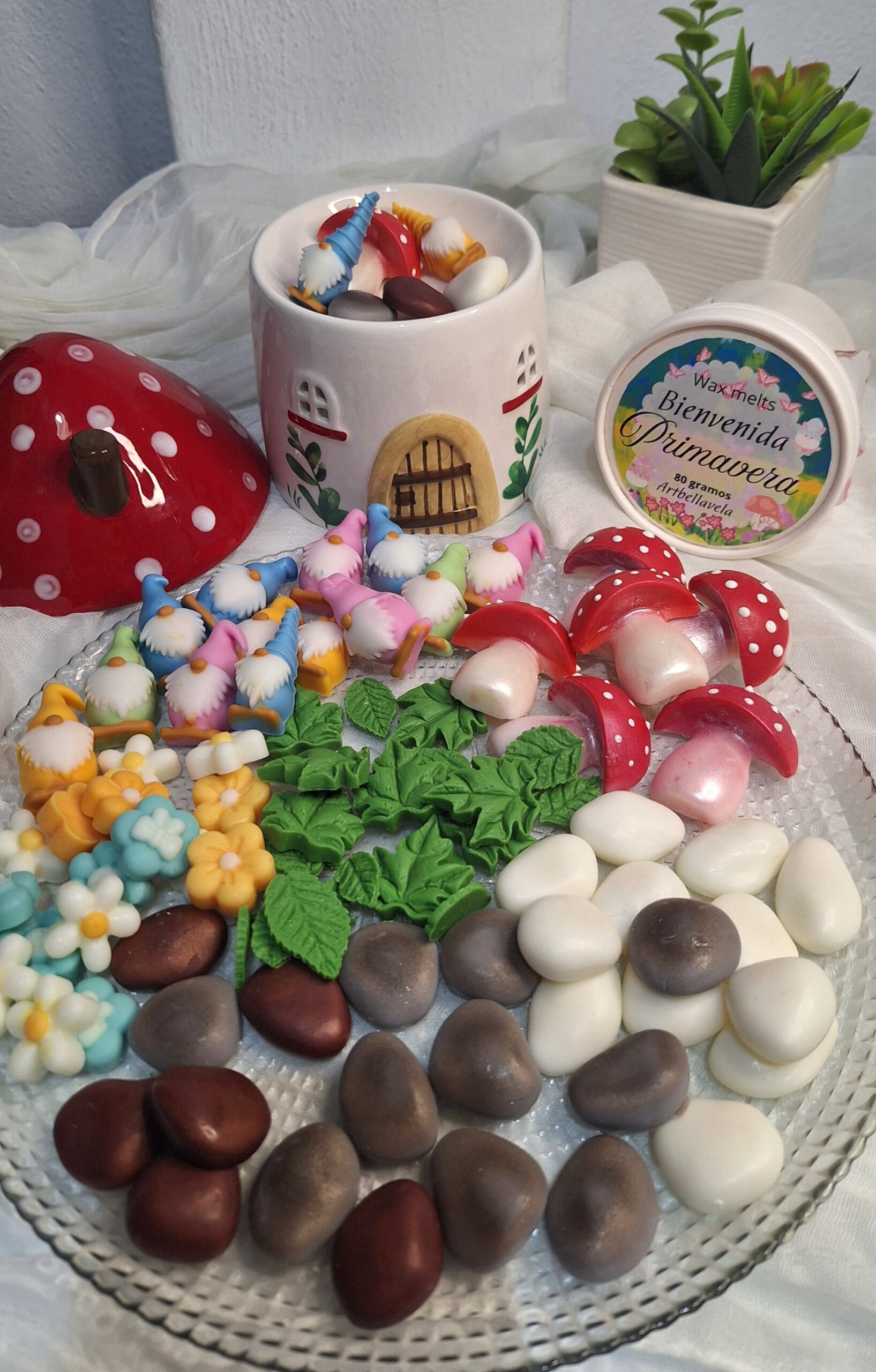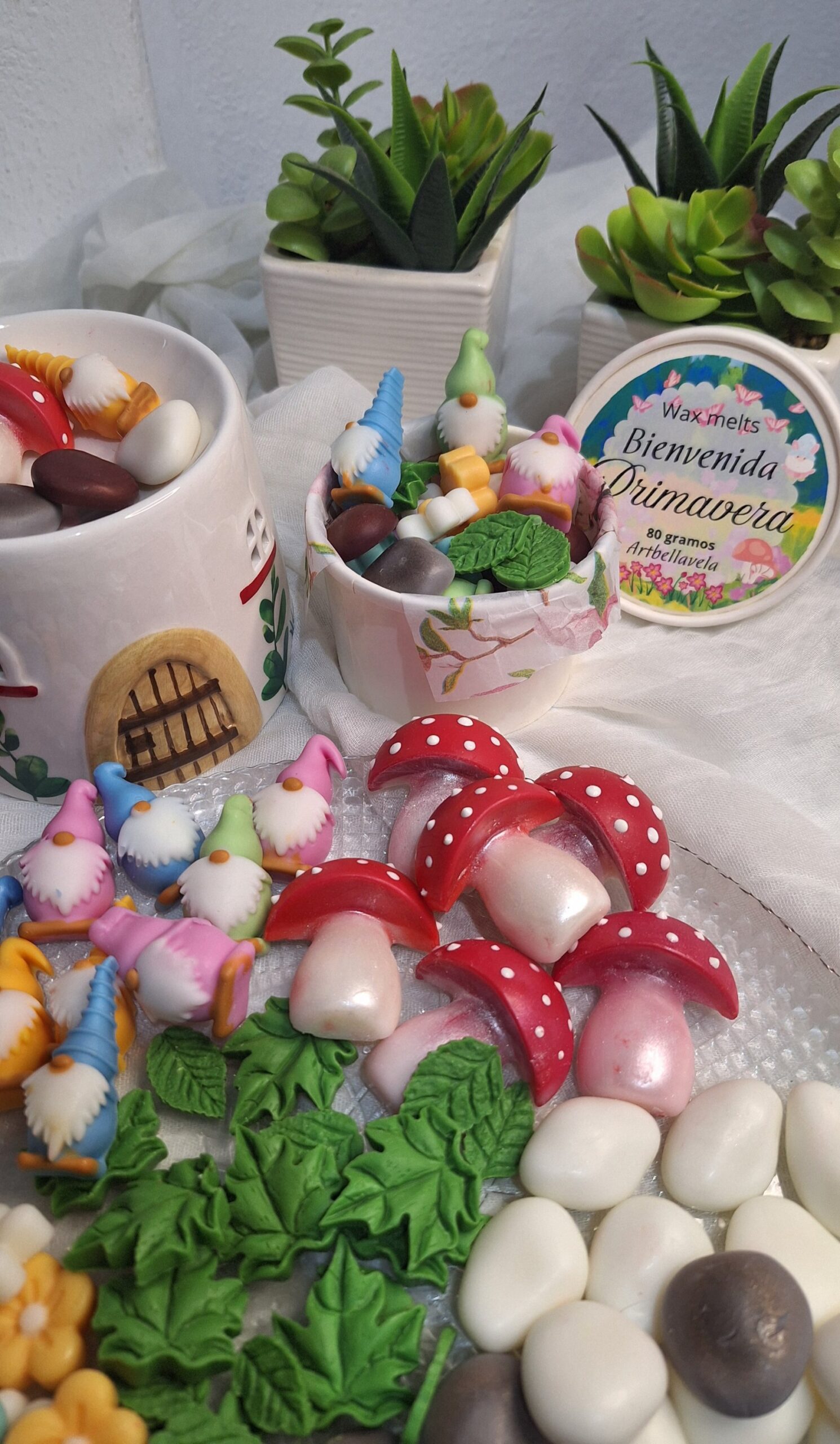 Este set incluye una escena completa de wax melts artesanales con gnomos, setas, hojas, flores y piedras, perfumadas con una fragancia primaveral suave y envolvente.