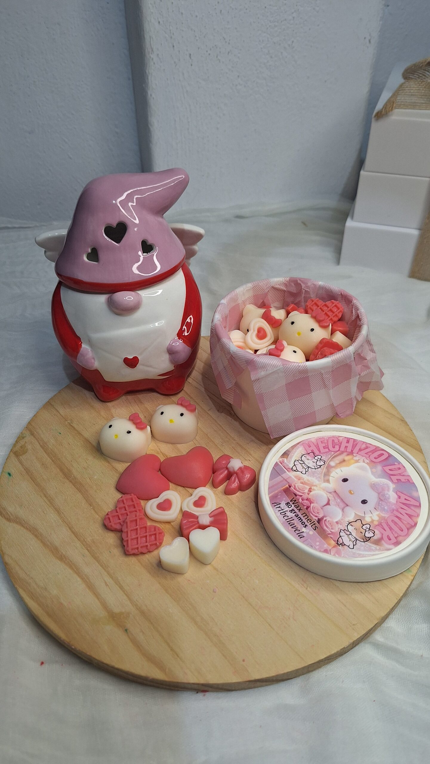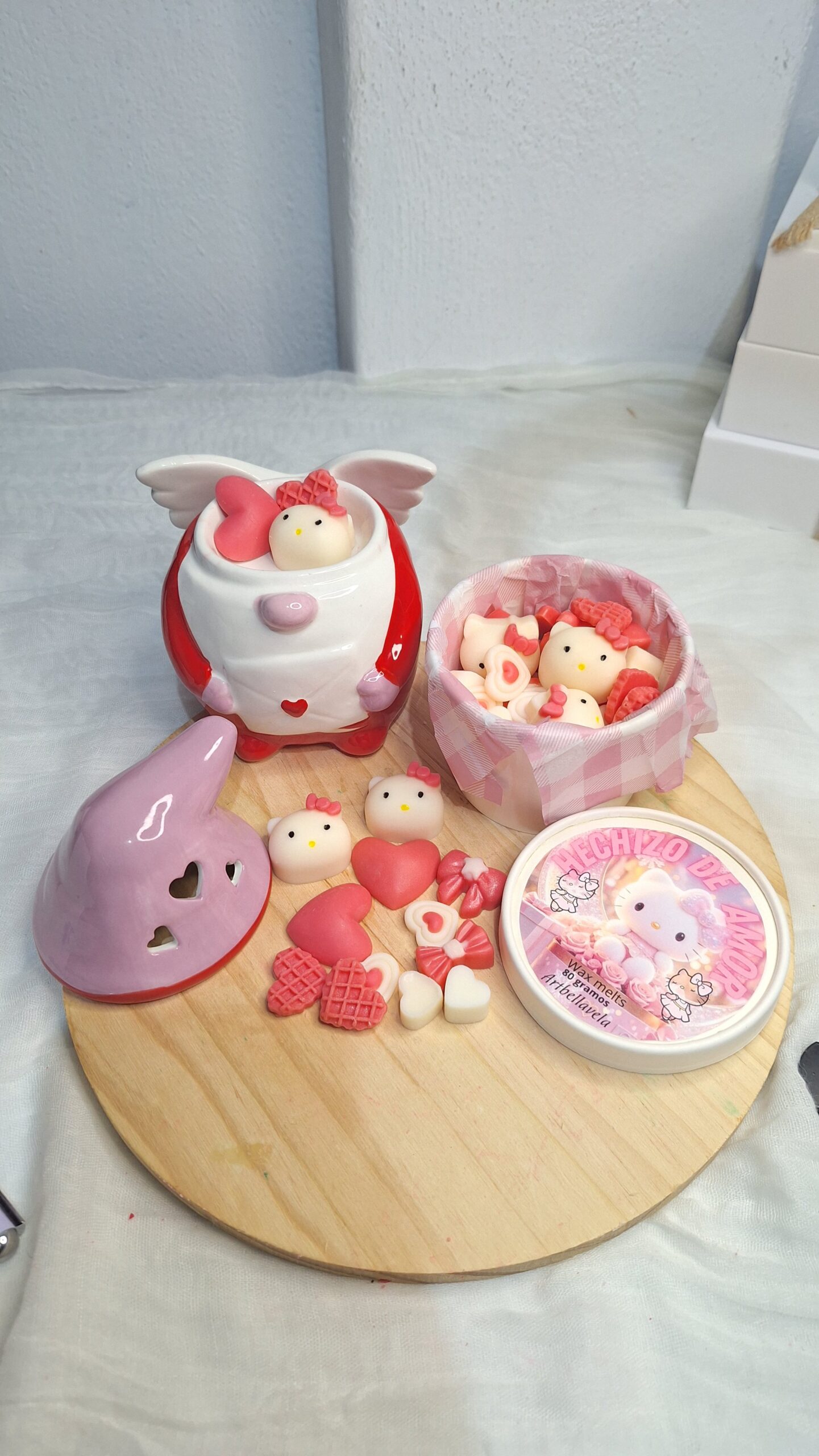 Inspirado en el encanto de Hello Kitty, su diseño en tonos rosa y blanco, con adorables figuritas y corazones, lo convierte en un detalle irresistible para los amantes de lo dulce y lo kawaii. Al derretirse, libera un aroma envolvente que crea un ambiente romántico y acogedor, perfecto para momentos especiales.