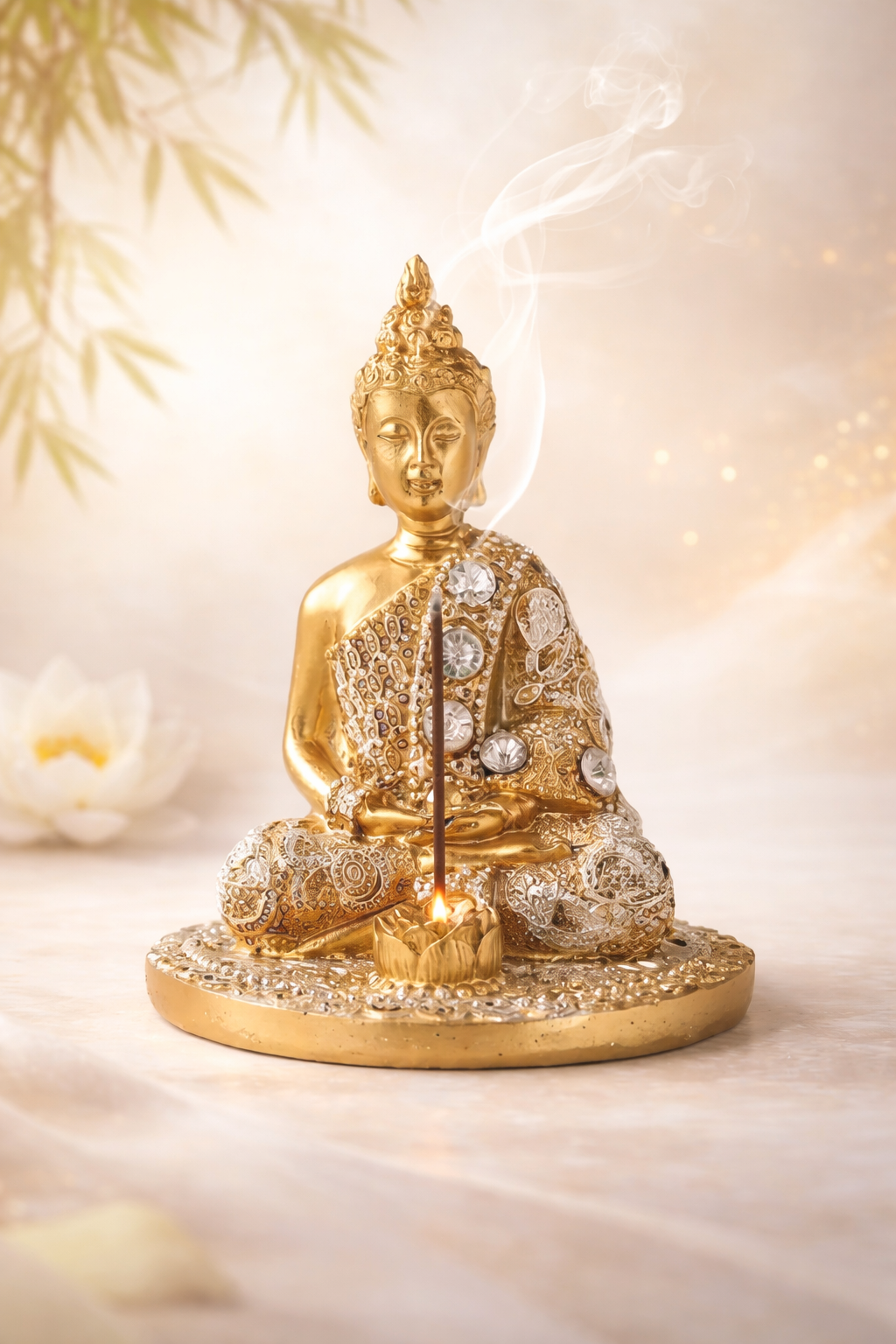 El acabado dorado brillante junto con los detalles ornamentales y piedras decorativas aportan un toque refinado y luminoso, ideal para crear un ambiente relajante en cualquier estancia. En la parte frontal incorpora un soporte integrado para varillas de incienso, permitiendo que el humo ascienda suavemente mientras perfuma el ambiente.