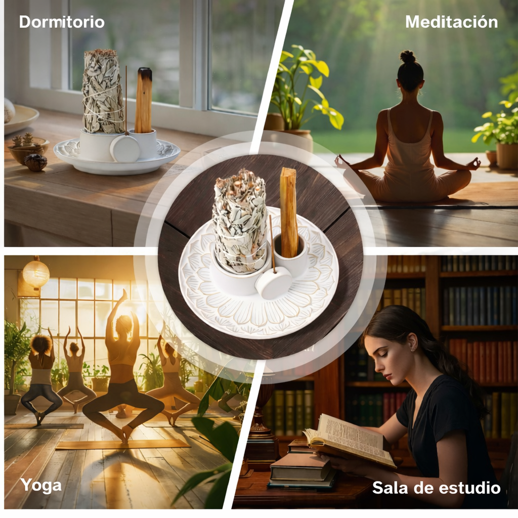 Fabricado en cerámica resistente y fácil de limpiar, este soporte multifuncional permite utilizar salvia blanca, palo santo, conos o varillas de incienso gracias a sus compartimentos integrados. Su estructura estable evita que la ceniza caiga fuera, manteniendo tu espacio limpio y ordenado.