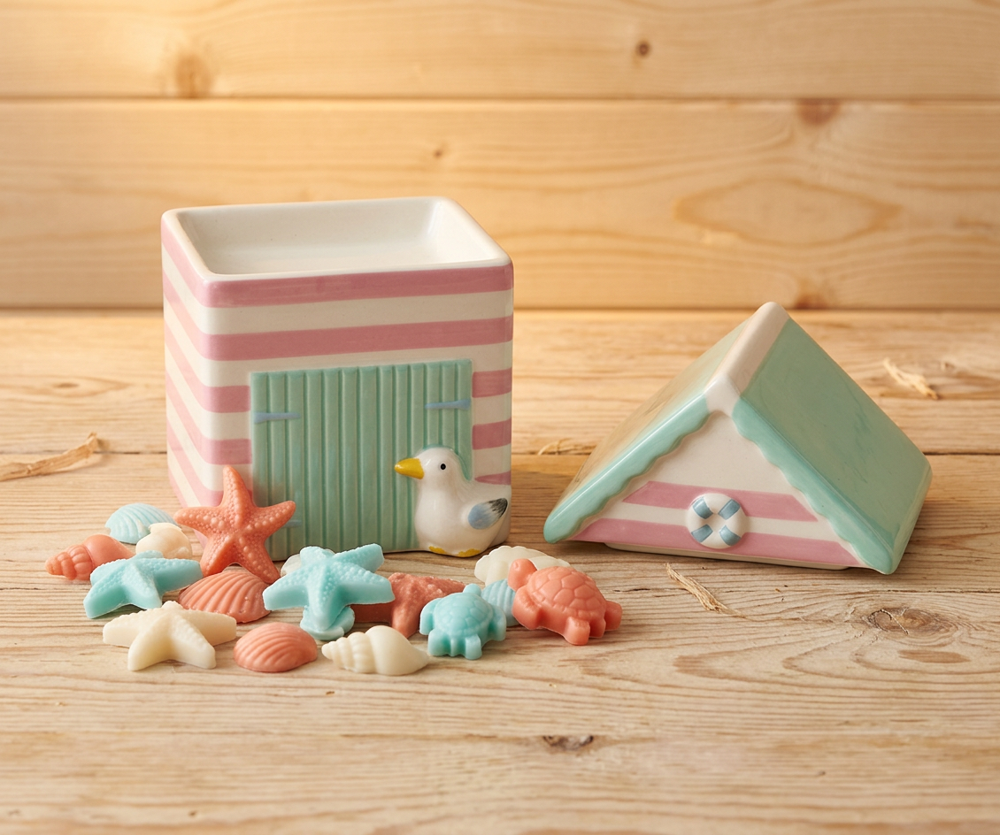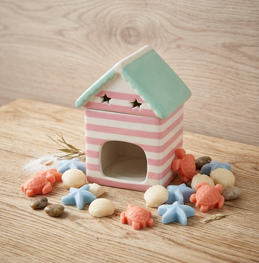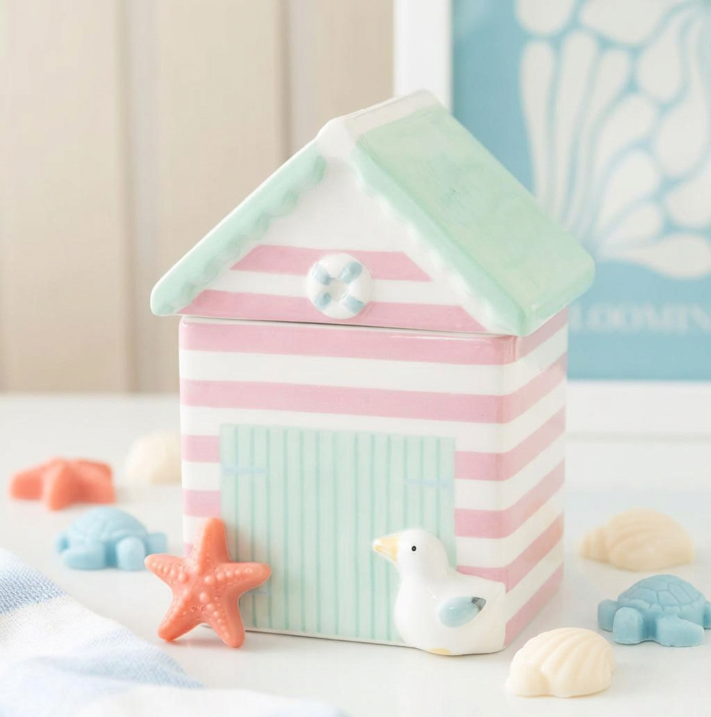 Quemador de wax melts con forma de casita de playa en cerámica pastel con rayas rosas y blancas, techo verde menta y detalles náuticos como ancla y pájaro blanco, diseño veraniego y encantador que evoca vacaciones costeras, ideal para aromatizar salones o baños con aromas marinos frescos y crear un toque playero acogedor en tu decoración hogareña