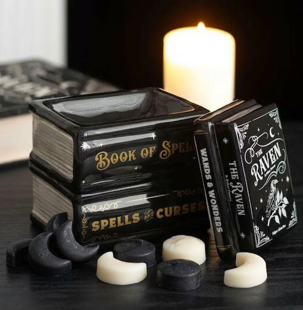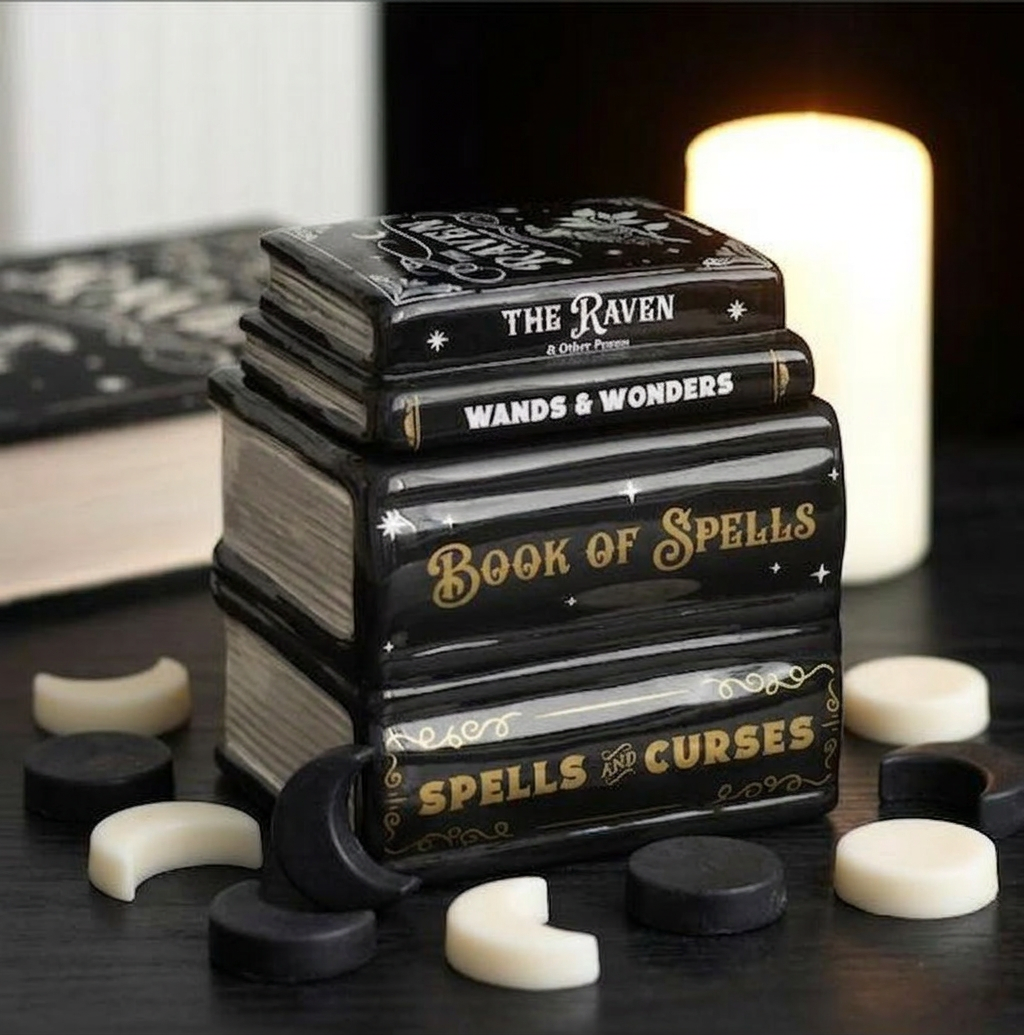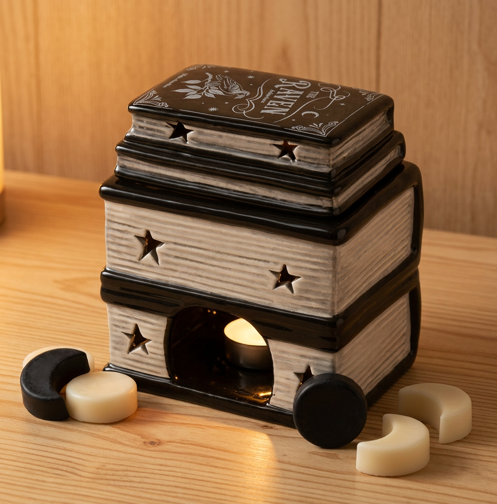Quemador de wax melts en forma de pila de libros antiguos de cerámica negra y plateada con detalles estelares y lunares, diseño encantador inspirado en “Luna Grimoire” para un rincón acogedor de lectura o salón boho, libera aromas suaves y envolventes con tus melts favoritos, ideal para decorar con estilo vintage y crear ambientes cálidos y misteriosos en casa