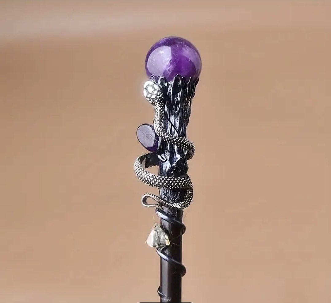 Esta varita de 26 cm captura la esencia del cosmos con su amatista púrpura en la punta sobre un mango negro refinado, abrazada por una serpiente plateada protectora con cristales que susurran secretos antiguos. (see the generated image above)La fusión de amatista y serpiente simboliza sabiduría intuitiva y transformación serena: la amatista calma la mente y eleva la espiritualidad, mientras la serpiente representa renovación y custodia eterna, uniendo paz interior con poder protector para equilibrar energías diarias.Usos EncantadosDecoración Mística: En estanterías o mesas para atraer calma y armonía ambiental.Meditación Suave: Soporte para momentos de reflexión, potenciando claridad y serenidad.Regalo Especial: Para quienes buscan un símbolo de crecimiento personal y misterio sutil.¡Equilibra tu mundo con esta varita transformadora! 🔮🐍