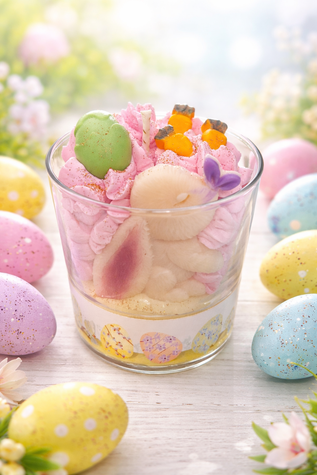 Con aproximadamente 200 gramos de cera, esta vela está decorada con una adorable escena de Pascua: un tierno conejito, pequeñas zanahorias y huevos de Pascua en tonos pastel que recuerdan a los dulces y decoraciones típicas de esta época tan especial. Cada detalle está elaborado a mano con mimo, creando una vela única que no solo perfuma tu hogar, sino que también decora cualquier espacio con un toque mágico.